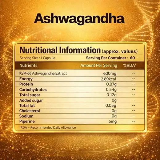 Each serving provides a powerful 600mg dose, making it an effective ashwagandha 600mg supplement for stress management, recovery, and hormonal support without overdosing.