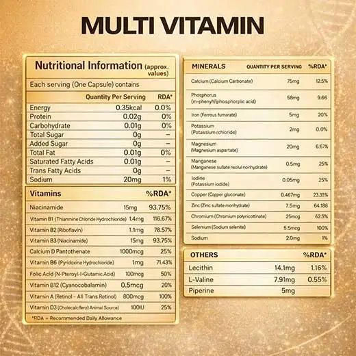 Struggling to get all your nutrients from food alone? Our Multivitamin supplement provides a complete blend of essential vitamins and minerals to fill nutritional gaps, boost energy, support immunity, and keep your body performing at its best — every single day.